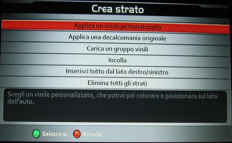 Con “A” lo stampiamo nella carrozzeria (riempiamo lo strato) con “B” annulliamo l’operazione e torniamo alla schermata precedente, con “X” cambiamo colore al vinile e con “Y” otteniamo lo stesso che con “A” solo che cloniamo il vinile e possiamo imprimerlo ancora altre svariate volte, fate attenzione a questo comando perché permette di disegnare, in quanto se ci creiamo un pennello (vinile) della forma adeguata e lo spostiamo imprimendolo via via che ci serve, avremmo ottenuto una specie di matita.
